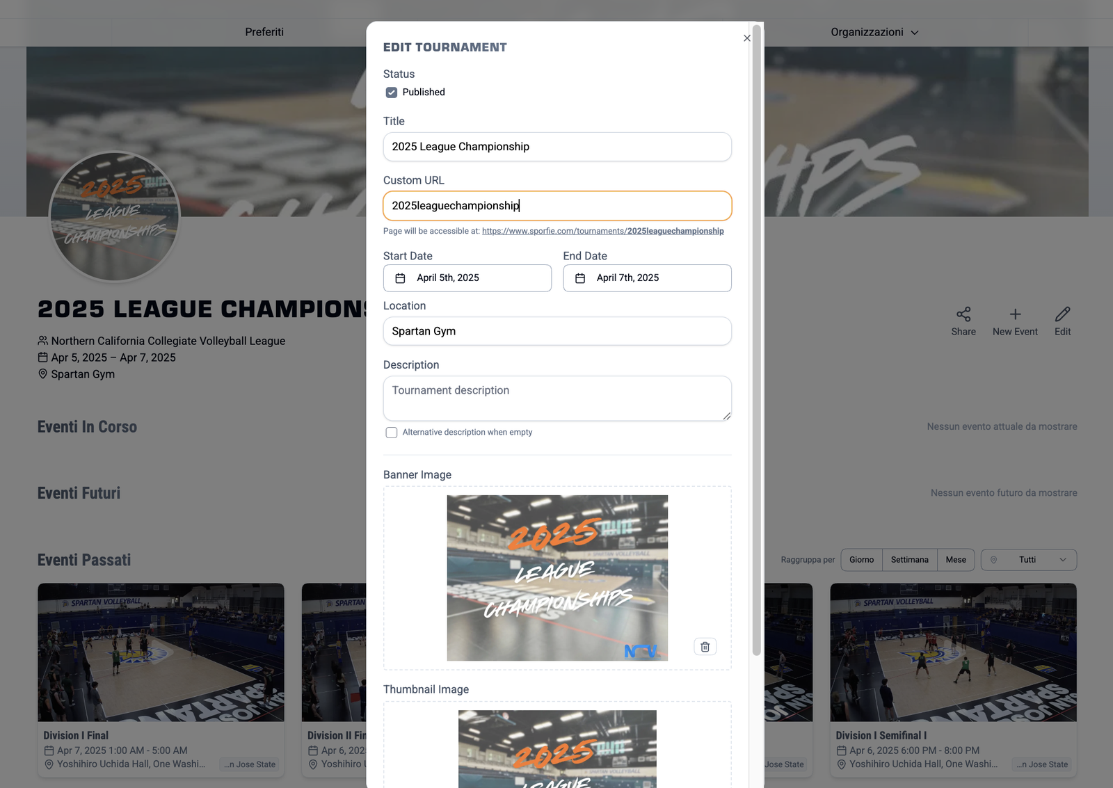 Gli organizzatori possono creare e gestire tornei direttamente dalla piattaforma. Collegare eventi, modificare informazioni, pubblicare o nascondere il torneo: tutto con pochi click.