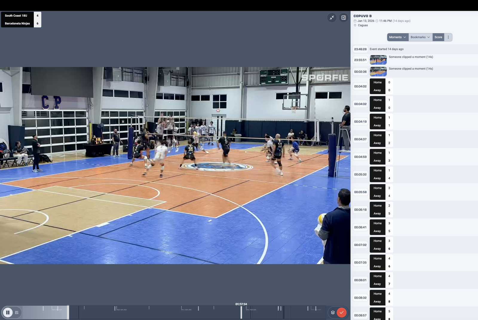 La timeline non mostra solo la durata del video: evidenzia i momenti importanti, i cambi di punteggio, le foto sincronizzate. Un colpo d'occhio per capire cosa è successo.